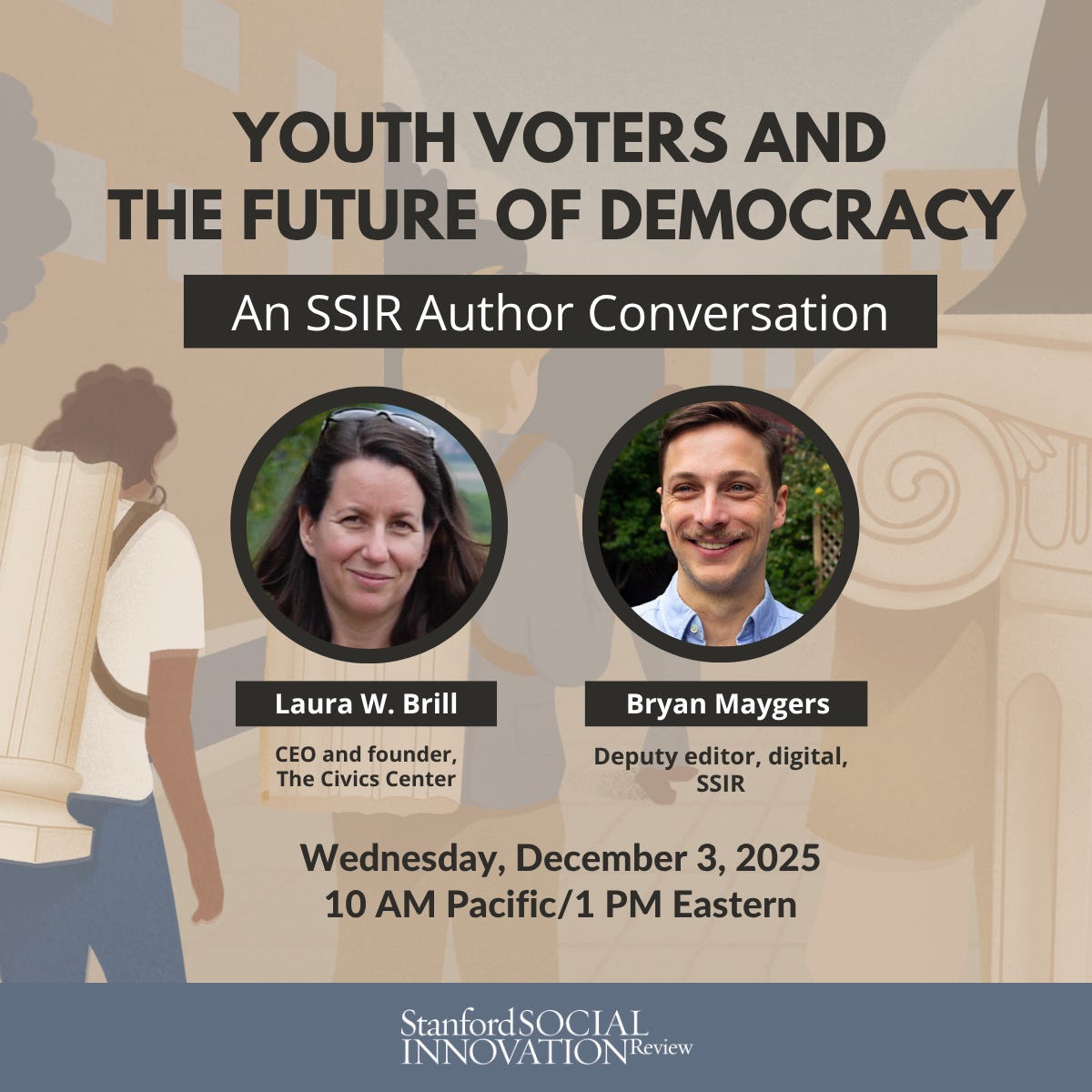 On Wednesday, December 3, I’ll be joining Stanford Social Innovation Review (SSIR) for a live author conversation about my forthcoming cover story, “Getting Youth Engaged in Democracy.” It’s a conversation about democracy and system design, what we’ve learned at The Civics Center, what’s at stake for young people, and what we need to build together.
